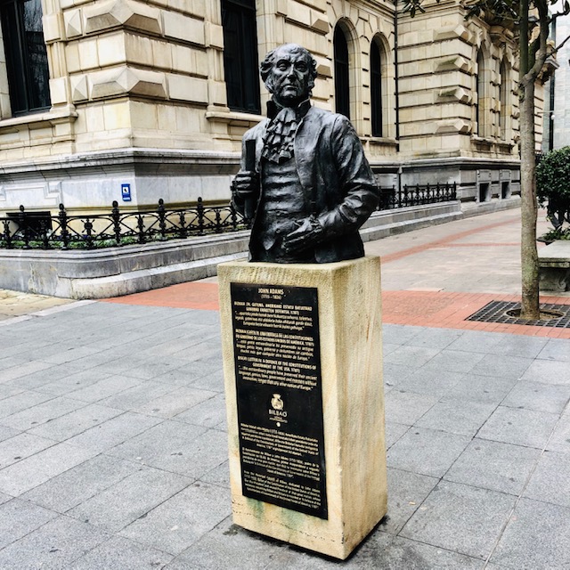 Voor het provinciehuis stond ik een maand geleden stil bij het standbeeld van niemand minder dan John Adams, tussen 1797 tot 1801 de tweede president van de Verenigde Staten. Al verder wandelend door de straat met die lange naam vroeg ik mij af hoe het zit met de blijkbaar speciale relatie tussen Bilbao en John Adams (1735-1826).