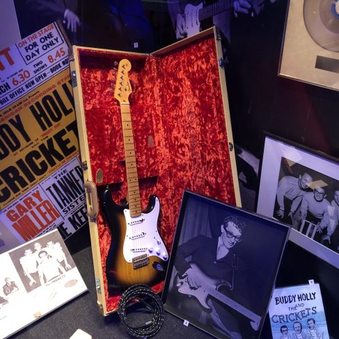 British Music Experience: gitaar van Buddy Holly (foto: René Hoeflaak)In mei bezocht ik het museum, afgekort BME, dat is te vinden in het imposante Cunard gebouw aan de Canada Boulevard. Op een toepasselijke plek. Want aan de overkant van de boulevard vertrekt de ‘Ferry cross The Mercey’ , staan de standbeelden van The Beatles, Engeland’s eerste rockster Billy Fury en de beschilderde portretten van de leden van Echo & The Bunnymen.