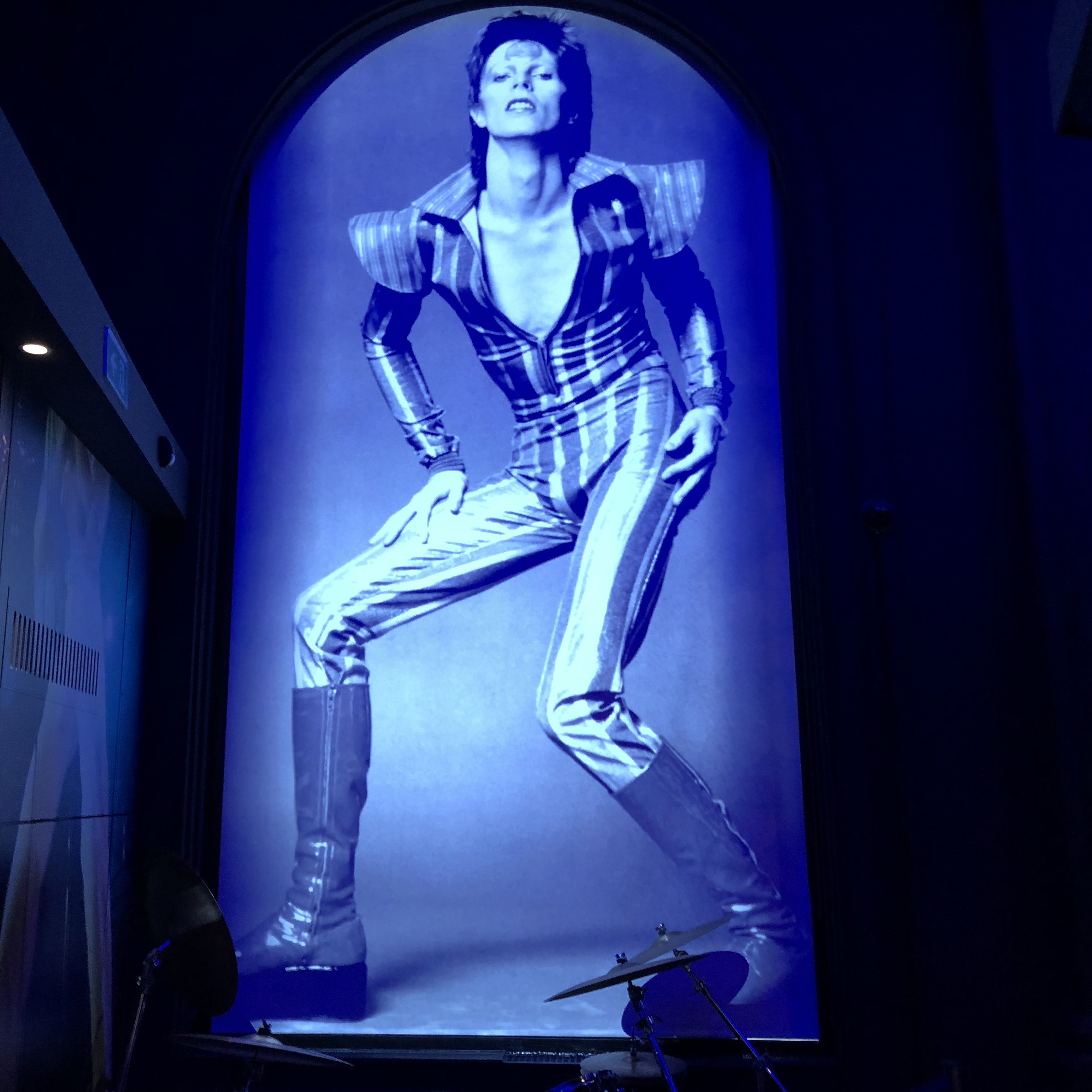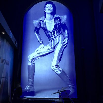 Foto van David Bowie aan de muur van het British Music Experience in Liverpool(foto: René Hoeflaak):De tijdlijn in het British Music Experience begint eind jaren veertig en neemt je mee langs zeventig jaar pop- en rockmuziek. Met een aaneenschakeling van posters, gitaren en gitaarkisten van artiesten als Keith Richards en Pete Townshend, singles, handgeschreven teksten, kostuums, laarzen, zoals die van The Sweet drummer Mick Tucker, platencontracten (van bijvoorbeeld The legendarische punkband The Buzzcocks) en – om nog maar iets te noemen- de slippers van Adam Ant.