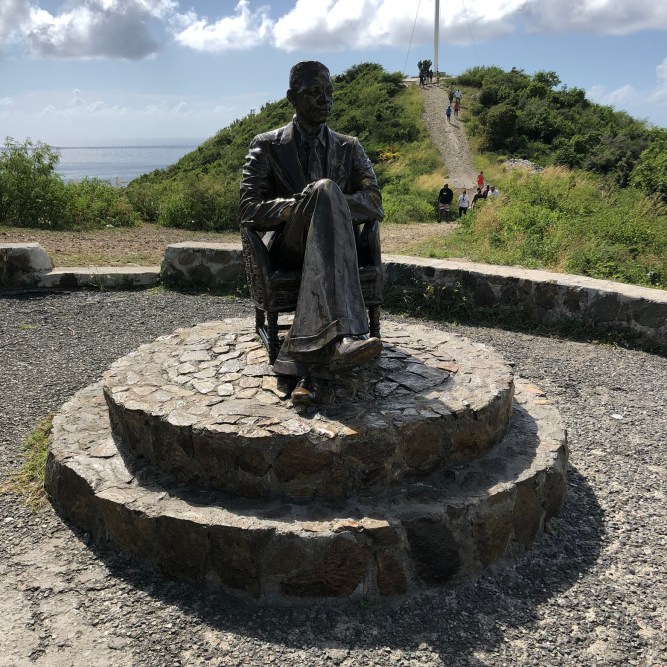 26 november 2019, Cole Bay, Sint-Maarten, Nederlandse-Antillen (foto: René Hoeflaak)Vanaf zijn landgoed in de Cole Bay op het Nederlands Caraïbische eiland Sint-Maarten geniet hij – dat wil zeggen standbeeld- al jaren vanaf zijn heerlijke luie stoel van het uitzicht over de Simpson Bay en bij helder weer op het eiland Saba. Zwijgend. Onverstoorbaar. Waakzaam. En trots op het naar hem genoemde uitkijkpunt, Bell’s Lookout Point, even verderop. Op zijn landgoed. Twee jaar geleden voorzien van steen, mast en vlag. Een prachtige plek om zoals ik, enkele weken geleden, te genieten van het uitzicht en de zwoele zeewind.