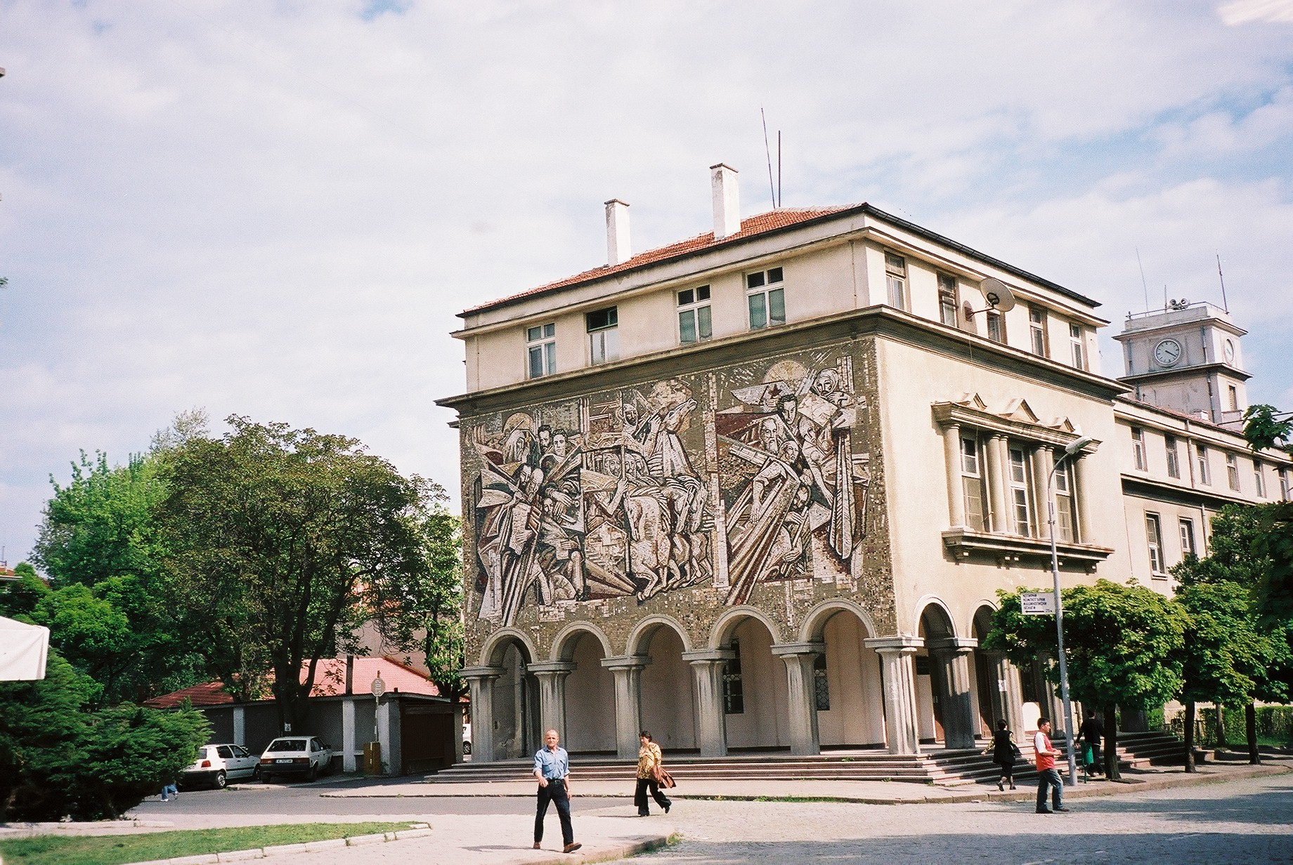 Mei 2005, Bulgarije, Kardzjali; Het straatbeeld is die van flatblokken met winkels, grote parken, brede straten, kleine kiosken, lada’s, gevelschilderingen, proletarische standbeelden. (foto: René Hoeflaak)