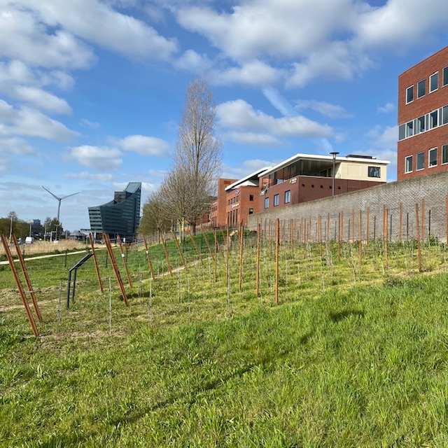 Eerder deze week wandelde ik langs de drukke N210 snelweg op de grens van Rotterdam en Capelle aan den IJssel, ook bekend als de Abraham van Rijckevorselweg. Vlakbij metrostation Capelsebrug passeerde ik een uniek stukje hellend bermgras, zijnde de voedingsbodem voor een glas Capelse wijn over pakweg drie, vier jaar. Nu nog met alleen wijnstokken, schelpen en gras. Maar over enkele zomers een perceel met rode en witte druiven. Ik heb het over een heuse wijngaard, daar langs de snelweg.