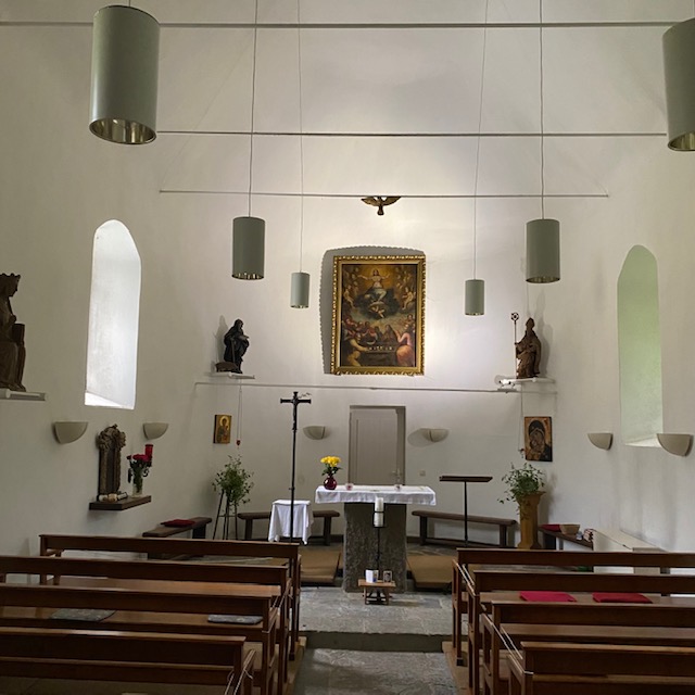 Van inmetselen is in Bévercé geen sprake. Integendeel. De kluizenarij, eigenlijk een kerk met 1 monnik, is in 1925 en 1981 nog gerestaureerd en staat er goed onderhouden en verzorgd bij. En de deur staat open. Ook op deze eerder vermelde zaterdagochtend. Ik hoopte eigenlijk de kluizenaar zelf te ontmoeten. Maar die heb ik niet gezien. Het bleef bij een kijkje in de kerk zelf.