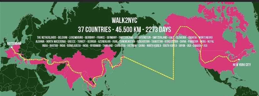 Op de website walk2nyc.com is te lezen hoe en waarom Arjen en Jette in zeven jaar door 37 landen wandelen. Op een wereldkaart staan de markeerpunten aangegeven. ‘’New York is onze richting en niet per definitie onze eindbestemming. Want onze wandeling staat immers in het teken van ontmoetingen. Daarom lopen we ook niet continu door de natuur maar meer in stedelijk gebied. Tot aan Zwitserland en verder in Europa staan de markeerpunten en de bestemmingen redelijk vast’’ aldus Arjen aan het begin van onze wandeling.