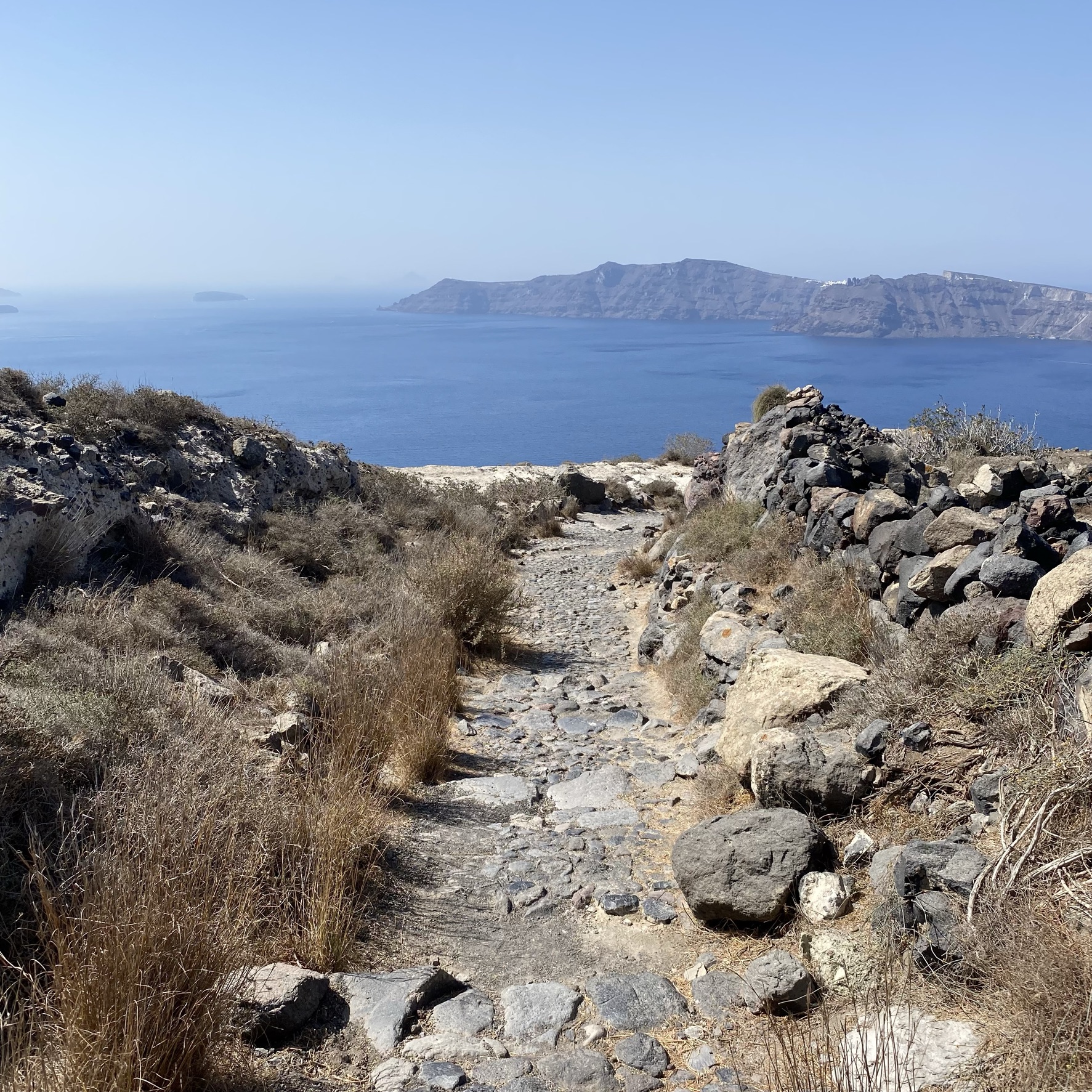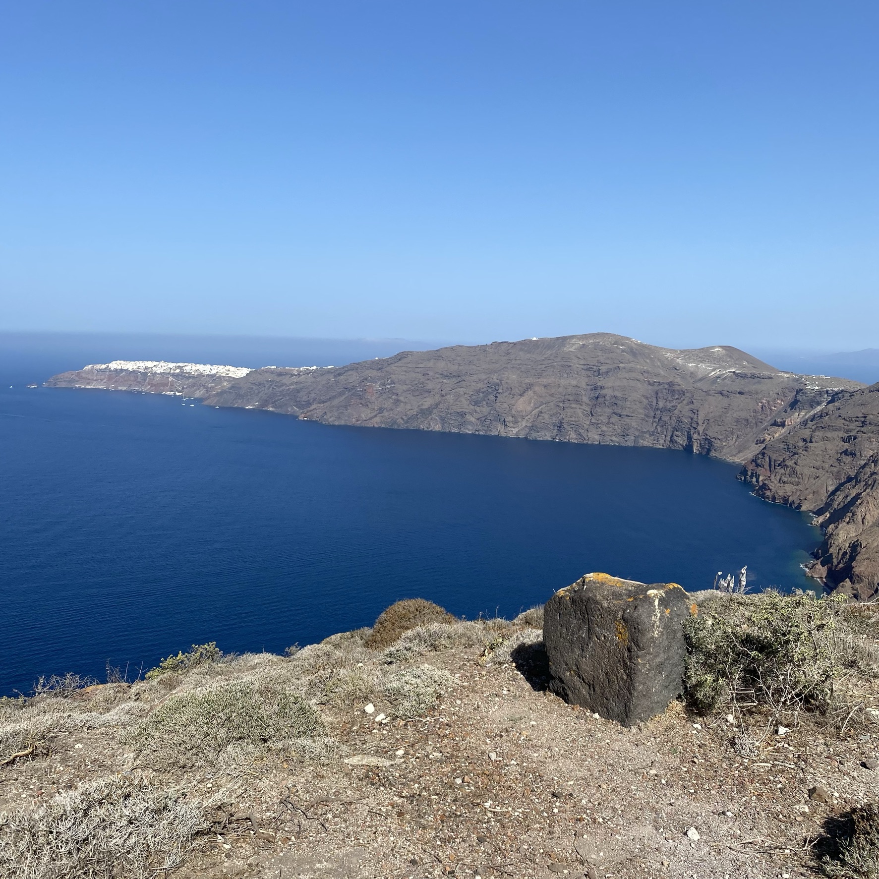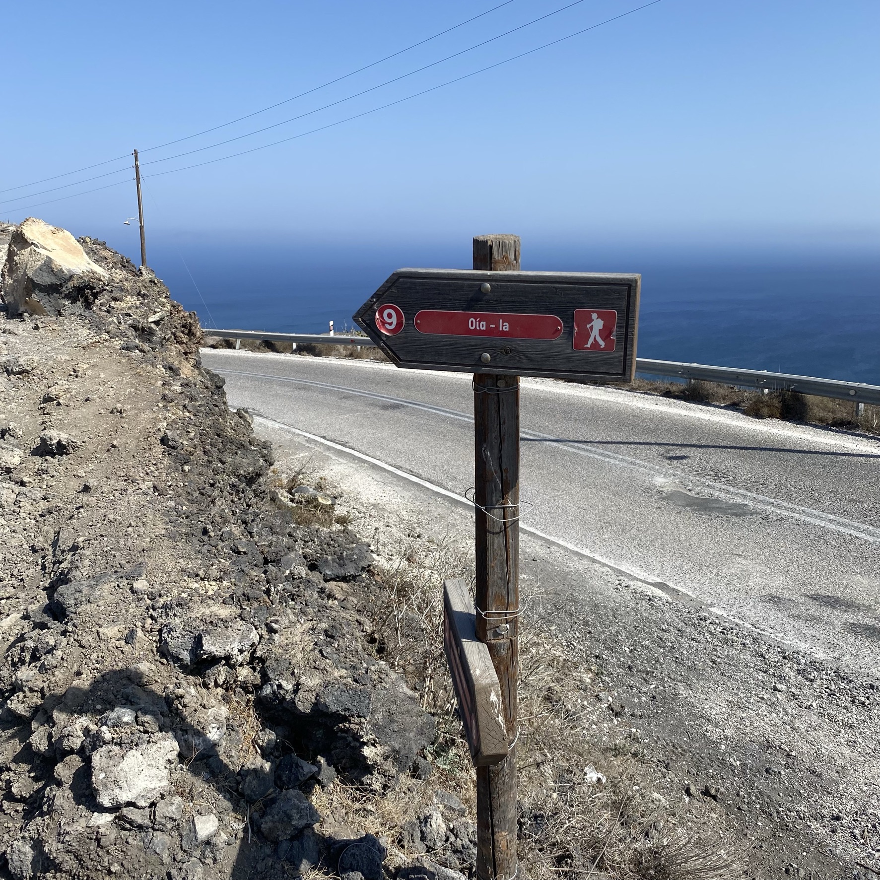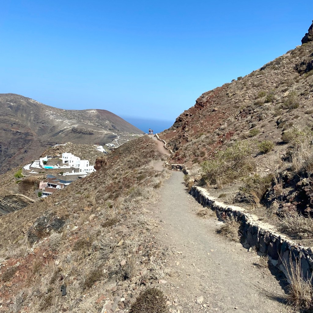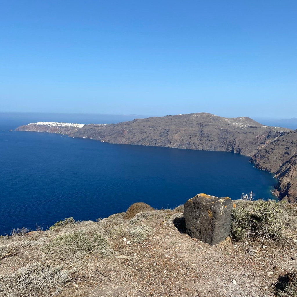 De wandeling van Fira naar Oia is zo’n 11 kilometer en goed te doen voor iedereen met een goede gezondheid en normale conditie. De route en weg wijst zich vanzelf. Verdwalen is onmogelijk. De zee links van je houden en in de richting van Oia lopen, dat je in de verte ziet liggen. En je loopt bovendien nooit alleen. Ik liep nu nog in coronatijd, dus redelijk rustig. Ik vrees, dat het nu aanzienlijk drukker is. Lees verder na de foto’s.