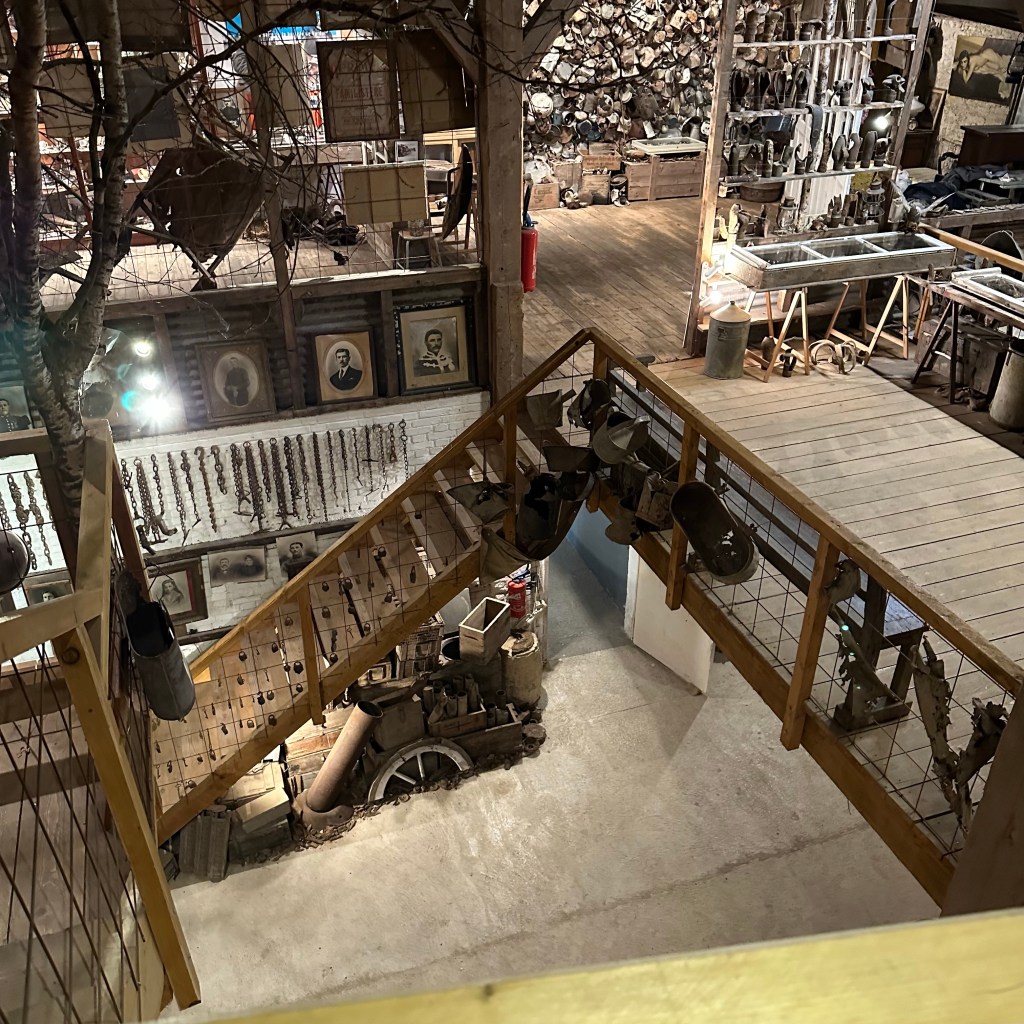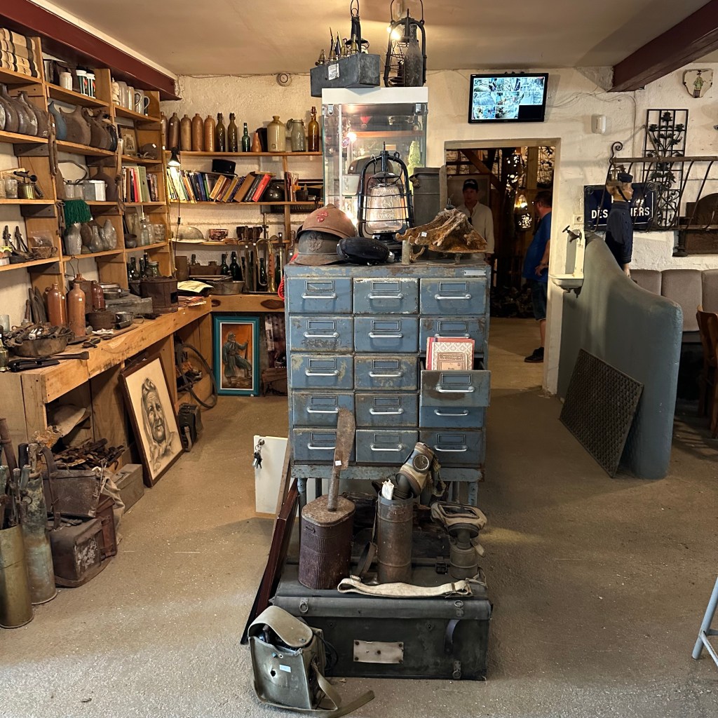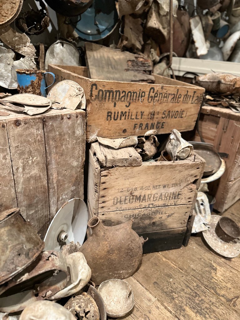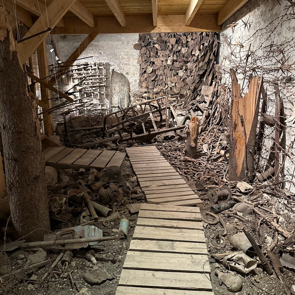 Overal om mij heen, op en aan de muren, vloeren, plafonds, vanaf de entree tot en met de twee verdiepingen boven mij en in de terrastuin, zie en voel ik aan de oneindige hoeveelheid verroeste helmen, versleten kledingstukken, munten, knopen, hulzen, schoenen geweren, drinkbekers, brieven, scheppen, gereedschap, laarzen, hoefijzers, schilderijen, kisten en foto’s. En zie en voel ik de waanzin, uitzichtloosheid, wanhoop, verwoesting en nutteloosheid van de miljoenen mensenlevens eisende Eerste Wereldoorlog. Lees verder na de foto’s.