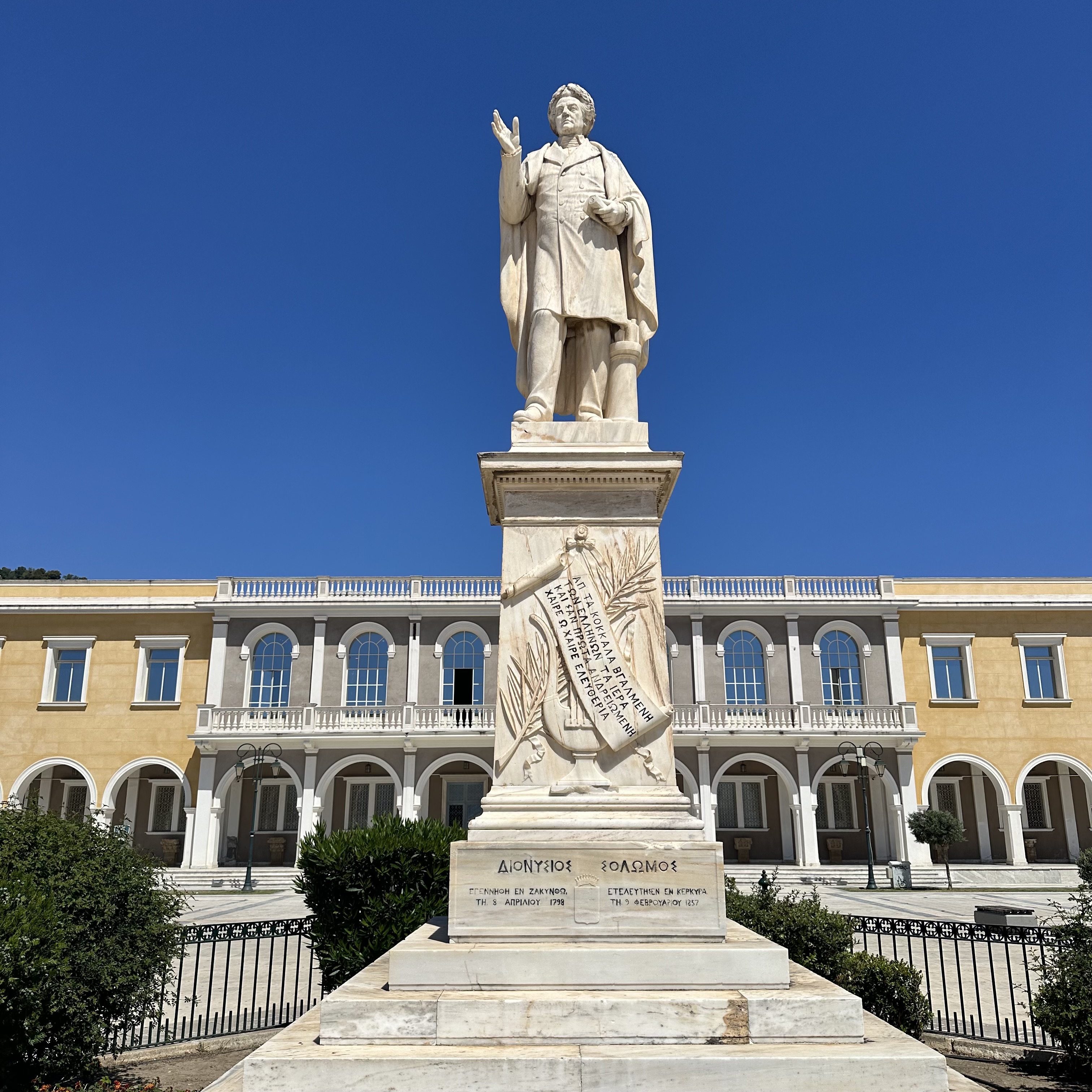 Zakynthos, ook bekend als Zante, is trots op haar bekendste inwoner en eert Solomos ook met een groot standbeeld. Uiteraard op het Solomosplein. Hoe en waar anders? Het standbeeld is gemaakt door de Atheense beeldhouwer Georgios Vroutos (1843-1909). Die Solomos was mij er eentje, want ook het bekendste museum van Zakynthos , eveneens te vinden op hetzelfde plein, draagt de naam van Dionysios Solomos. Lees verder na de foto.