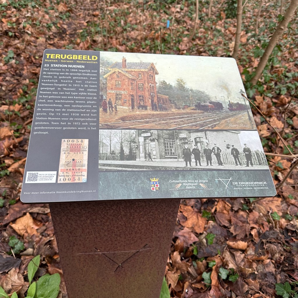 De teksten en vooral de foto’s op de borden doen ons verlangen de tijd terug te draaien en deze wandeling op de eerste vrijdag van 1925 over te doen. En wellicht alhier op het voormalige station Nuenen-Tongelre na een praatje met de stationswachter de trein naar Venlo te nemen. Oude tijden herleven in Eeneind! We zijn honderd jaar te laat.