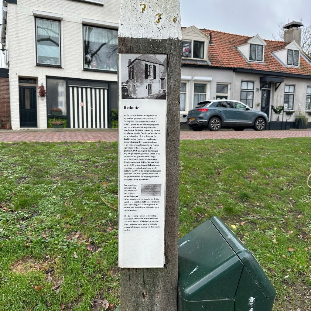 Maar eind goed, al goed. Als een oase in de woestijn maakte een informatiezuil in ieder geval een einde aan de eindeloosheid en teleurstelling. Een opsteker. De informatiezuil wees mij namelijk op de Redoute, het op één na oudste gebouw van Stad aan’t Haringvliet. En niet zo maar een gebouw. Lees verder na de foto.
