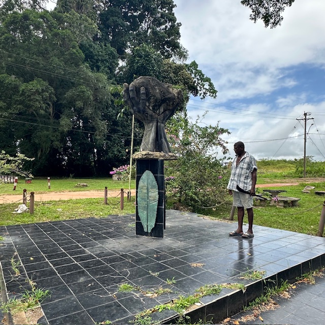 Het monument is ook het startpunt van onze wandeling. En de plek waar Gilbert en ik beiden staan te popelen om Onoribo binnen te wandelen. Ik uit nieuwsgierigheid, Gilbert om zijn enthousiasme en liefde voor zijn geboortegrond te delen. ´Dit is mijn dorp, dit is mijn alles’