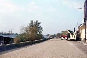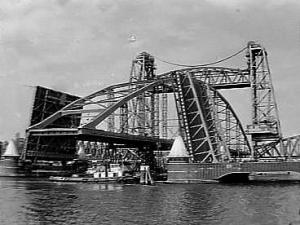 1967; De Merwedebrug passeert de Hef in Rotterdam op weg naar plaatsing tussen Papendrecht en Dordrecht (foto ontvangen van Otto de Groot)